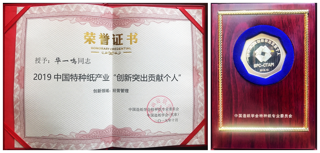 公司副总经理华一鸣荣获中国特种纸产业"创新突出贡献个人”称号